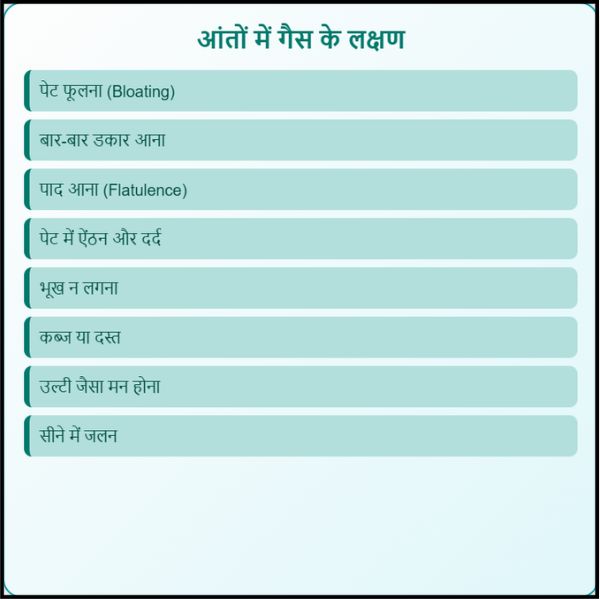 आंतों में गैस होने पर कई तरह के लक्षण दिखाई दे सकते हैं। ये लक्षण हल्के से लेकर गंभीर तक हो सकते हैं। नीचे प्रमुख लक्षण पॉइंट-वाइज दिए गए हैं: