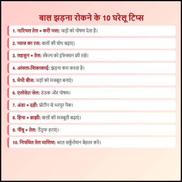 बालों का झड़ना एक ऐसी समस्या है जो देखने में छोटी लगती है, लेकिन यह आत्मविश्वास और मानसिक स्वास्थ्य को प्रभावित कर सकती है। ऊपर बताए गए 10 घरेलू उपाय न केवल प्राकृतिक और सुरक्षित हैं, बल्कि इन्हें नियमित रूप से अपनाने से बालों का झड़ना काफी हद तक कम हो सकता है। इन उपायों के साथ-साथ संतुलित आहार, तनाव प्रबंधन, और सही हेयर केयर रूटीन अपनाकर आप अपने बालों को मजबूत, चमकदार, और स्वस्थ बना सकते हैं।