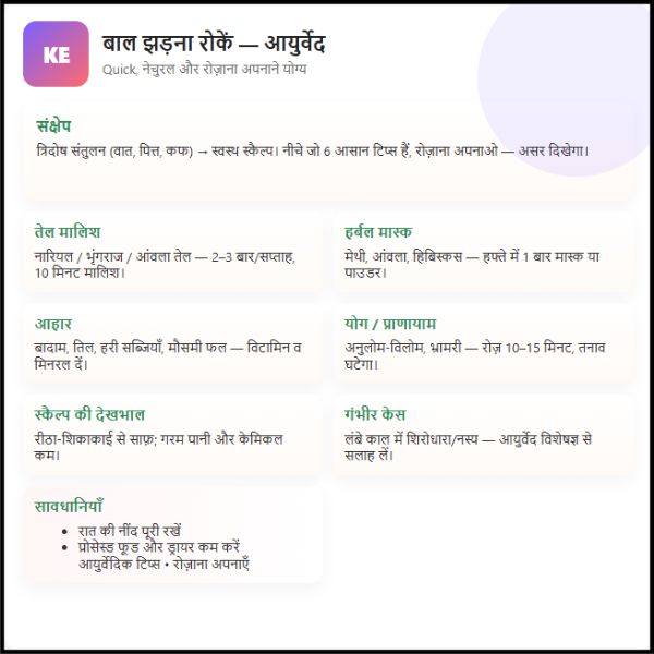 आयुर्वेद में बालों का इलाज सिर्फ एक तेल या हर्बल पेस्ट से नहीं, बल्कि जीवनशैली के बदलाव, संतुलित आहार, नियमित योग और प्राकृतिक देखभाल से होता है। अगर आप नियमित रूप से इन उपायों को अपनाते हैं, तो कुछ ही हफ्तों में आपको बाल झड़ने में कमी और उनकी मजबूती में फर्क नजर आएगा।