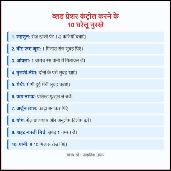 ब्लड प्रेशर कंट्रोल करने के 10 घरेलू नुस्खे