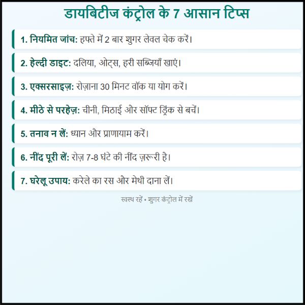 डायबिटीज एक ऐसी बीमारी है जो सही देखभाल और अनुशासन के साथ कंट्रोल की जा सकती है। सही खानपान, नियमित व्यायाम, तनाव प्रबंधन और समय पर दवा—ये चार स्तंभ हैं जो डायबिटीज को काबू में रखने में मदद करते हैं। इन 15 उपायों को अपनी दिनचर्या में शामिल करके आप न केवल अपने ब्लड शुगर लेवल को नियंत्रित कर सकते हैं, बल्कि एक स्वस्थ, सक्रिय और खुशहाल जीवन भी जी सकते हैं।