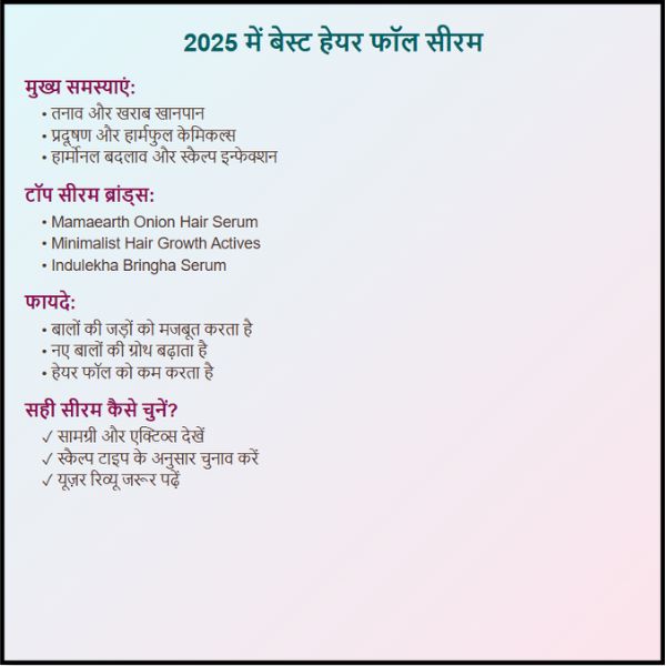 इस लेख में हम आपको भारत में मिलने वाले कुछ बेस्ट हेयर फॉल सीरम्स की पूरी जानकारी देंगे। साथ ही बताएंगे कि इन्हें कैसे इस्तेमाल करें, किन चीज़ों का ध्यान रखें, और आपके लिए सबसे सही विकल्प कौन सा रहेगा।