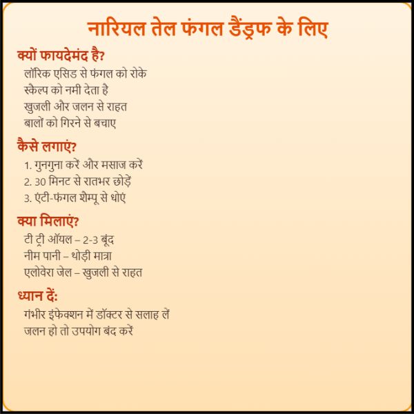 नारियल का तेल फंगल डैंड्रफ के लिए एक प्राकृतिक और प्रभावी उपाय हो सकता है, खासकर इसके एंटी-फंगल और मॉइश्चराइजिंग गुणों के कारण। इसे टी ट्री ऑयल, नीम, या एलोवेरा जैसे अन्य प्राकृतिक सामग्रियों के साथ मिलाकर उपयोग करने से इसके फायदे बढ़ जाते हैं। हालांकि, इसे सही तरीके से और नियमित रूप से इस्तेमाल करना जरूरी है। अगर आपको डैंड्रफ की समस्या बार-बार हो रही है या यह ठीक नहीं हो रही, तो तुरंत किसी त्वचा विशेषज्ञ से सलाह लें।