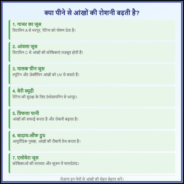 नमस्कार दोस्तों जैसा की आप सभी लोग जानते हैं। की क्या पीने से आंखों की रोशनी बढ़ती है? जैसे की क्या आप भी उन लोगों में से हैं जो हर सुबह चश्मे के बिना अखबार पढ़ने या फोन चलाने का सपना देखते हैं? अगर हाँ, तो यह लेख आपके लिए है! आज की भागदौड़ भरी जिंदगी और डिजिटल स्क्रीन के बढ़ते इस्तेमाल ने हमारी आँखों पर काफी दबाव डाला है। ऐसे में आँखों की सेहत बनाए रखना और उनकी रोशनी बढ़ाना एक बड़ी चुनौती बन गई है। लेकिन घबराइए नहीं! प्रकृति ने हमें ऐसे कई अद्भुत पेय दिए हैं जो हमारी आँखों की शक्ति को बढ़ा सकते हैं और उन्हें कई बीमारियों से बचा सकते हैं।