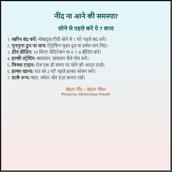 - अगर नींद न आए, तो घंटों बिस्तर पर करवटें न बदलें। उठकर 5-10 मिनट टहलें या किताब पढ़ें।